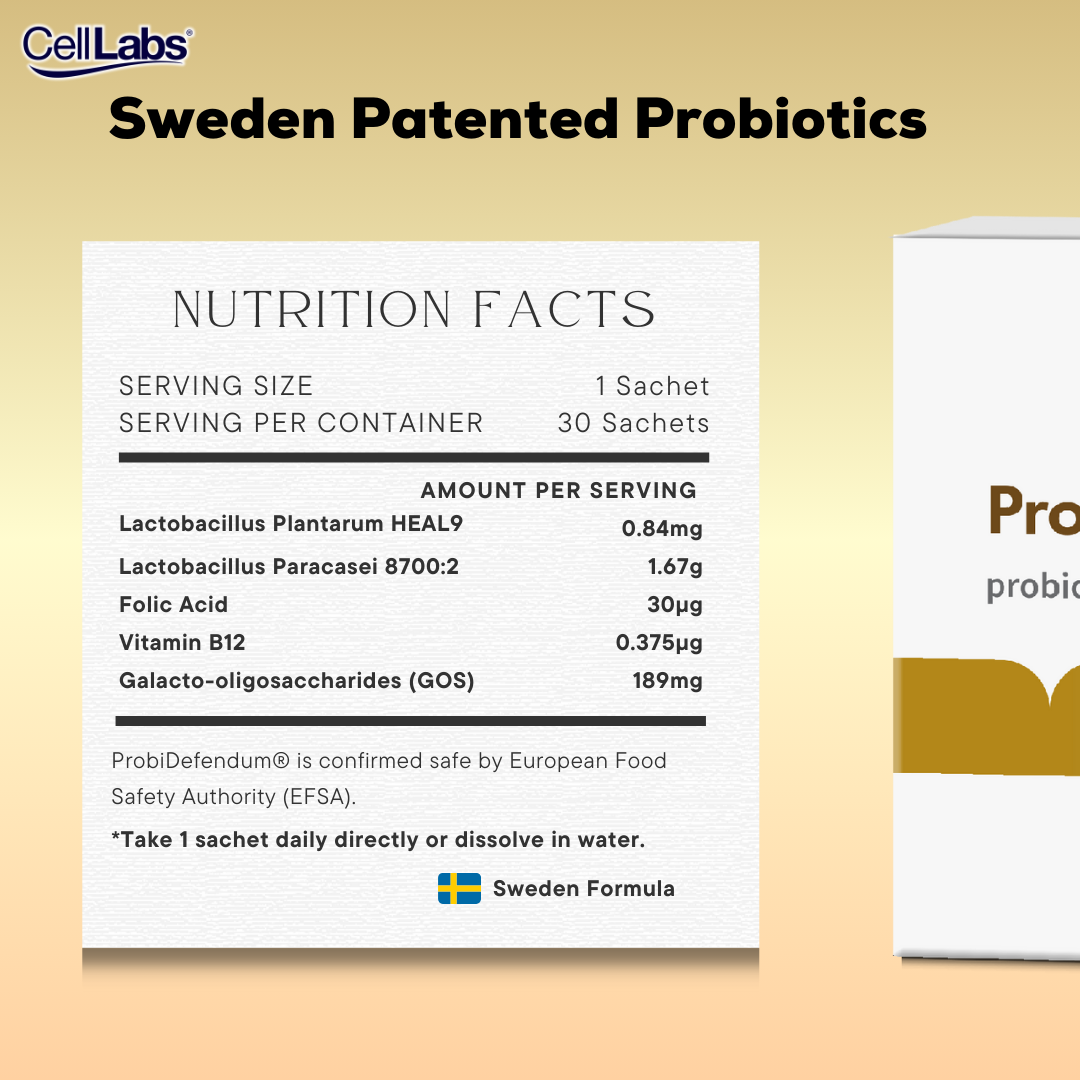 CellLabs® ProbiDefendum® features clinically proven combinations of two probiotic strains by Sweden Immune Concept. Combined studies on ProbiDefendum® shows that it is capable of enhancing the immune system. CellLabs® ProbiDefendum® further enhances this with our patented formulation to give you more efficacy.